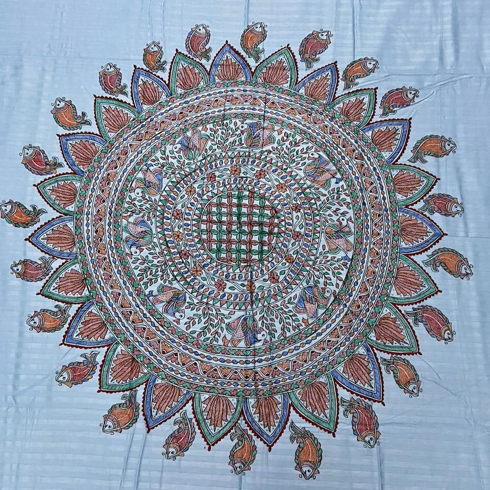 This Mithila Folk Art Style Double bed sheet with Pillow Cover set can enhance the beauty of the living. It can be be used as ethenic decor product for gifting purpose. Make a style statement by owning Mithilagram Super brand products and enhance your home decor . Work with multicolor Fish and Flower Design is done on it which has a symbolic significance in mithila culture .
